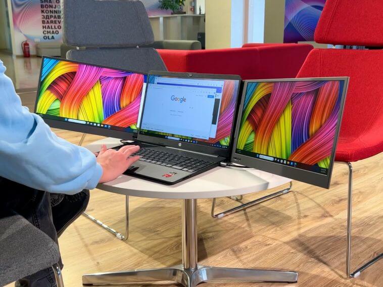 Introducing Flex Pro 15.6": effortlessly place it to the back of your Mac or Windows laptop with its integrated kickstand. Connect it with a single USB cable and watch as your three-screen workstation springs into action.